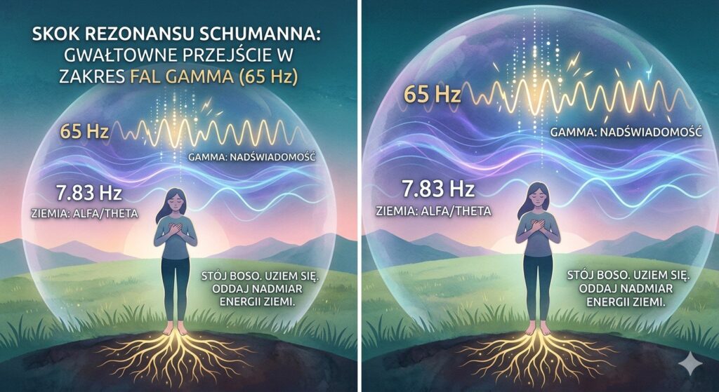 Nasze mózgi naturalnie pracują w rytmie 7,83 Hz (fale Alfa/Theta – spokój). Kiedy ziemskie pole „uderza” z dużą mocą w zakresach wyższych (Gamma, ok. 40-70 Hz), nasz układ nerwowy próbuje się do tego dostroić.